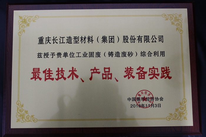 2018年被中国循环经济协会授予工业固废(铸造废砂)综合利用最佳技术、产品、装备实践。